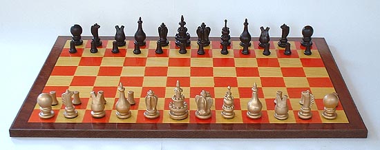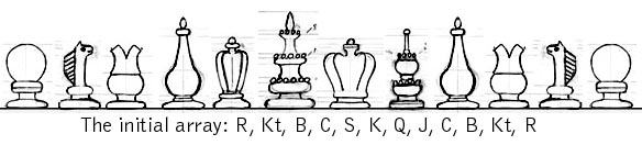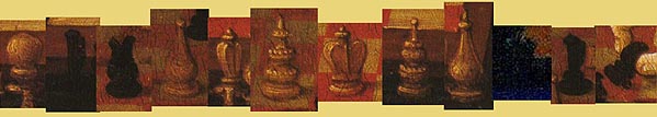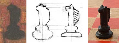 The game in the foreground turns out to be no mere prop, but an instructive presentation of the game itself. Studying the picture carefully, we see that each piece is deliberately represented, some more than once, and some at various angles. After analyzing the position and the identities of the pieces, and comparing the various renditions of each piece, we have selected a representative of each one, imagined it as a whole piece, defined what its form and measurements must have been – and finally reconstructed it as faithfully as possible. The result is a chess set so true to the painting that one can imagine the painting was made from these very pieces. One can step right into the painting and play the game. The pieces in the painting:sketches defining the forms: The pieces recreated: |